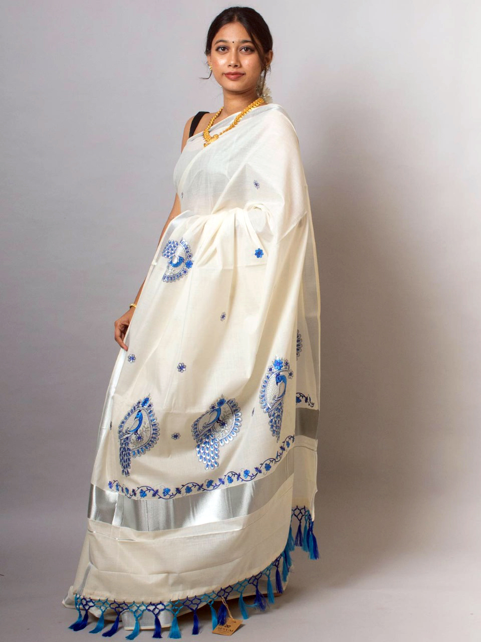 The Kerala Cotton Embroidered saree fusions traditional style with intricate embroidery, attract to those who value enduring beauty and cultural charm.