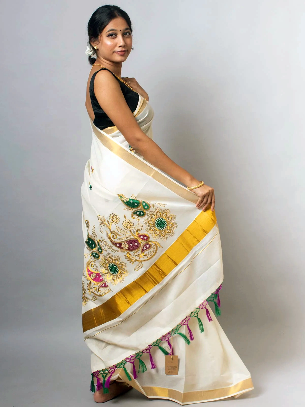 The Kerala Cotton Embroidered saree blends stylish elegance with intricate embroidery, perfect for those who appreciate timeless grace and traditional charm.